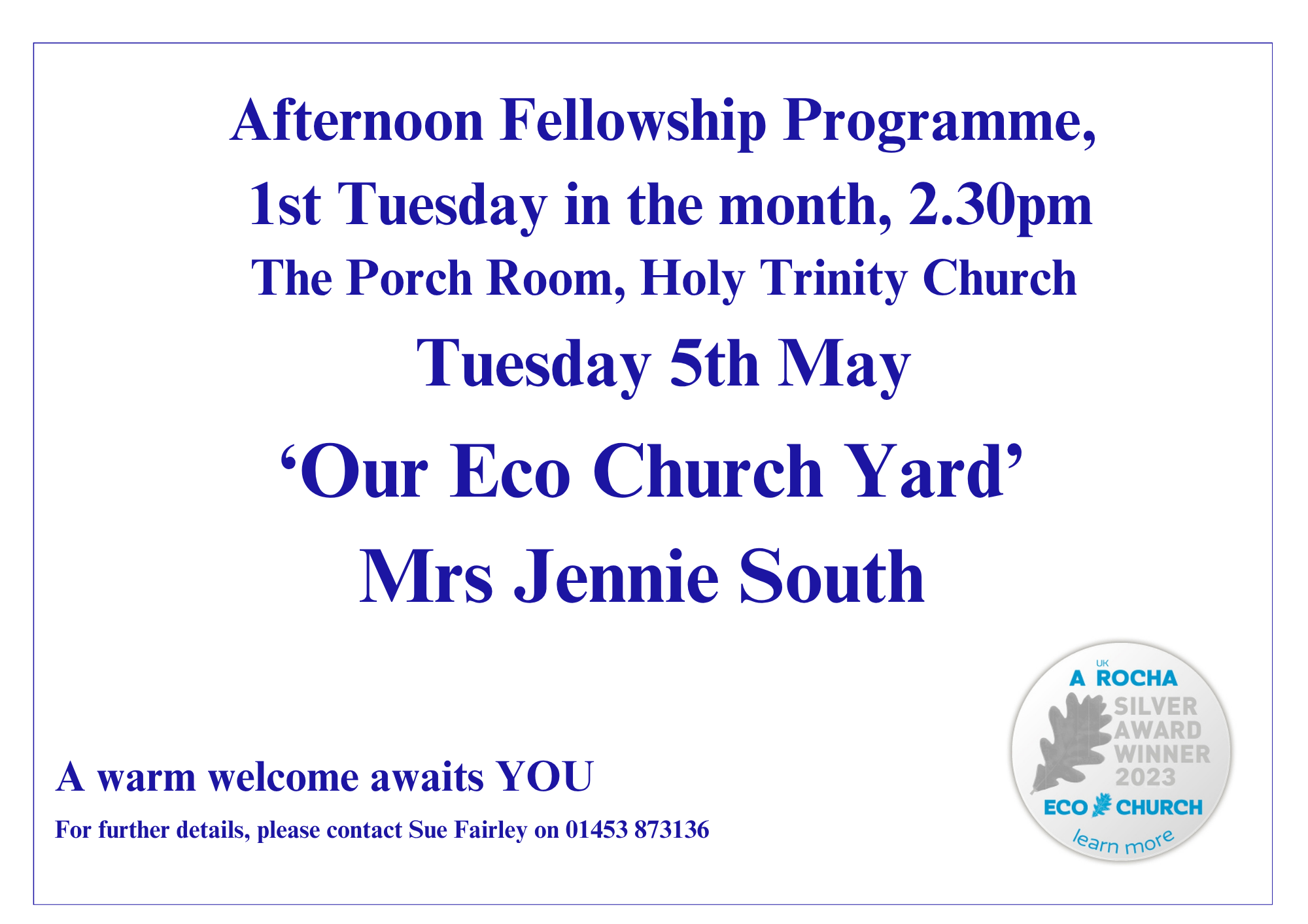 Holy Trinity Church, Minchinhampton Holy Trinity Church, Minchinhampton5th May, 2.30pm, Afternoon Fellowship. Join the Afternoon Fellowship Group with guest speaker Jennie South talking about ‘Our Eco Church Yard’