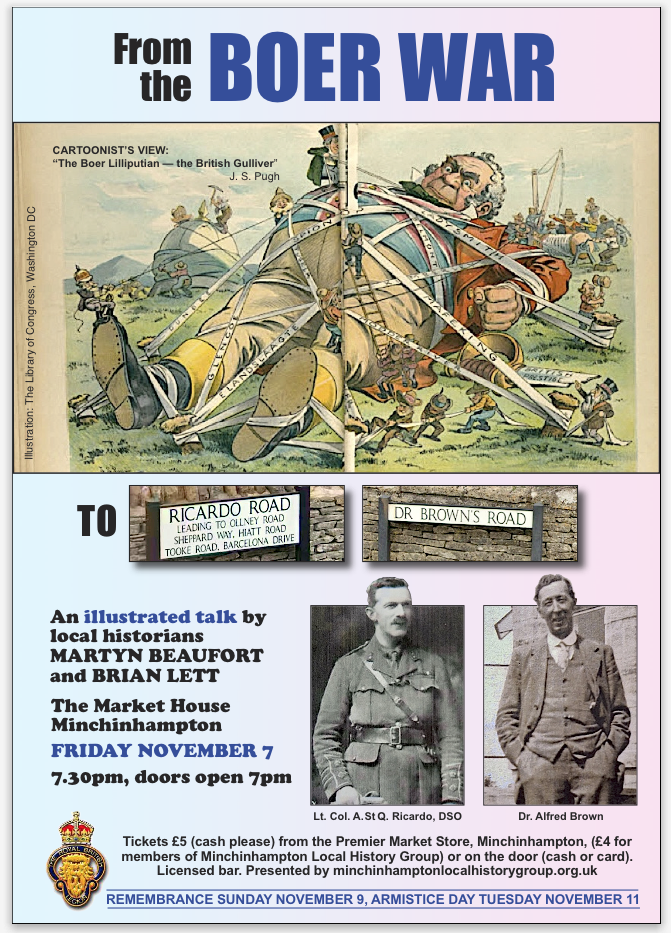It is a Remembrance talk by the local History GroupEssentially, the talk is about Minchinhampton men's involvement in the Boer War, the Minchinhampton casualties, something about the Ricardos and Dr Brown of Dr Brown's Road . Brian Lett will do the first half, Martyn Beaufort will do the second half . We are not confining… Read More »Remembrance Talk: Minchinhampton Local History Group